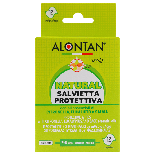 ALONTAN NATURAL è una salvietta protettiva a base di citronella, eucalipto, salvia. Queste sostanze di origine vegetale sono estratte da piante note per le loro attività protettive. Ha una formula che mantiene la pelle morbida, idratata e gradevolmente profumata (non per le zanzare!).