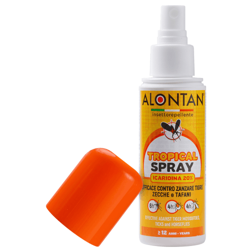 ALONTAN TROPICAL è uno spray anti zanzare, anti zecche e anti tafani a base di icaridina 20% che protegge immediatamente dopo l'applicazione.