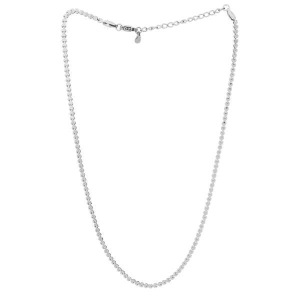 Abbraccia l’eleganza senza tempo! Caratterizzata da un disegno di catene sottili e raffinate, questa collana si distingue per la sua grazia e semplicità. La fluidità con cui gli anelli si connettono tra loro dona un movimento armonioso al pezzo, creando un’aura di luce e sofisticatezza attorno a chi la indossa. Il piccolo ciondolo che pende delicatamente vicino alla chiusura aggiunge un tocco distintivo, rendendola perfetta sia per occasioni speciali che per l’uso quotidiano.
