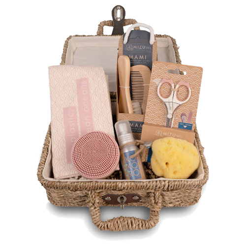 Il set è composto da forbicine con punte arrotondate, tagliaunghie, limetta neonato, spazzola massaggiante per la testa, spazzola in silicone con setole morbide, pettine, spugna naturale di mare dal mediterraneo, spray KOKORO Relax&Balsamic a base di oli essenziali e una pochette in cotone con scomparti.
