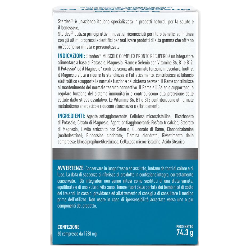 Stardea® MUSCOLO COMPLEX PRONTO RECUPERO è un integratore alimentare a base di Potassio, Magnesio, Rame e Selenio con Vitamine B6, B1 e B12. Il Potassio* ed il Magnesio* contribuiscono alla normale funzione muscolare. Inoltre, il Magnesio aiuta a ridurre la stanchezza e l’affaticamento, contribuisce al bilancio elettrolitico e supporta la normale funzione del sistema nervoso. Il Rame contribuisce al mantenimento del normale tessuto connettivo. Il Rame e il Selenio supportano la regolare funzione del sistema immunitario e contribuiscono alla protezione delle cellule dallo stress ossidativo. Le Vitamine B6, B1 e B12 contribuiscono al normale metabolismo energetico e riducono stanchezza e affaticamento.